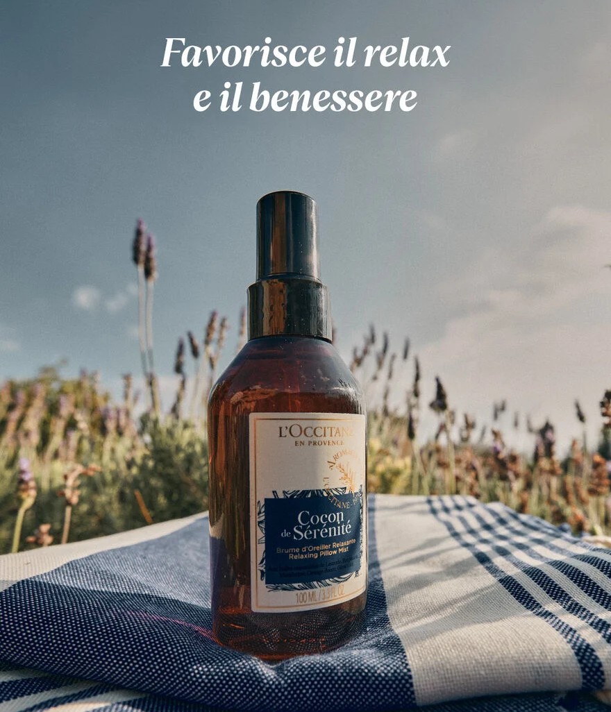 Lo Spray per Cuscino Rilassante è composto da un cocktail d'olio essenziale di Lavanda DOP, d'arancia dolce e di Geranio. Aiuta a profumare la casa, biancheria, lenzuola e cuscini e promuove un'atmosfera confortevole e armonizzante in casa. Tieni il flacone dritto e vaporizza attorno al cuscino 15 minuti prima di coricarti per creare un'atmosfera rilassante, propizia al sonno e al benessere.